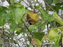 緑の葉の間、真ん中の黄色っぽい枯れ葉の左下に横縞(よこしま)模様が隠れているのが見えるでしょうか。