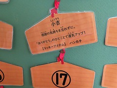 筒を何度も振って、穴を下に向けると番号のついた細い棒が出てきます。その棒の番号を壁にぶら下がった絵馬から探して裏を見ると、そこに今日の運勢が書いてあるのです。