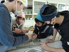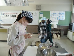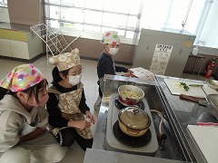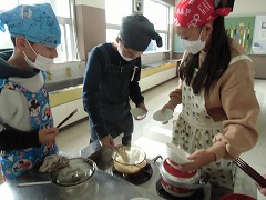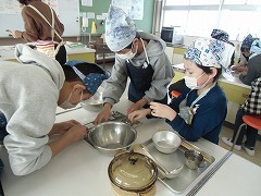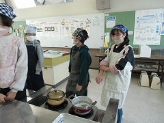 先日、5年生が家庭科で調理実習をしました。土鍋や耐熱ガラスの鍋でご飯を炊き、煮干しからだしを取った味噌汁を作りました。
