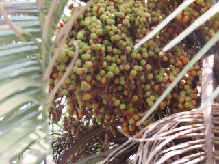 ※ 写真を見るとココスヤシの木についている実はまだ熟していないのかオレンジ色にはなっていません。このあと、一つ一つオレンジに熟してから落ちるのか、全体がオレンジ色に染まるのか楽しみです。 全体が染まったら、一気に実が下に落ちるのでしょうか?