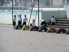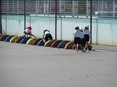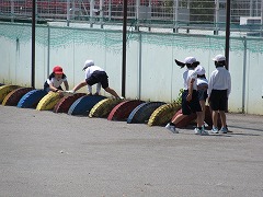 2年生が体育で、「馬とびじゃんけん」に取り組んでいました。プールよこにあるタイヤで、2チームに分かれて両はしから馬とびをしていき、出会ったところでじゃんけんをします。勝った人はそのまま進みますが、負けたチームは外に出て後ろにもどらなければなりません。負けたチームはすぐに次の子が出発します。