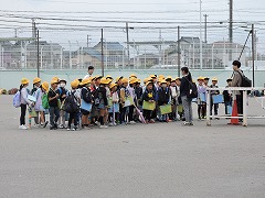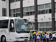 後ろの北館の窓には3年生が見送るために手を振ってくれています。