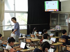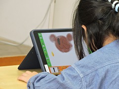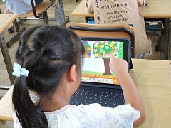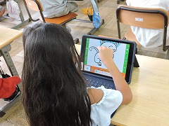 1年生がタブレットを使っていろいろな絵を描いていました。みんな、線の色や太さを変えるばかりでなく、筆のように線を書いたりぼかしたり、同じ絵をスタンプのように何度も押したりなど、いろいろな使い方をすることができます。