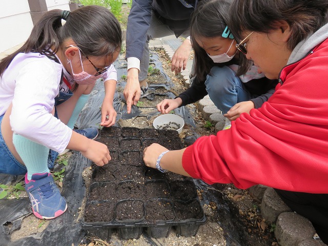 4年生の理科教材として、へちまの種をまきました。児童クラブに来ていた人に手伝ってもらいました。詳しくは、「4年生の部屋」に掲載されています。