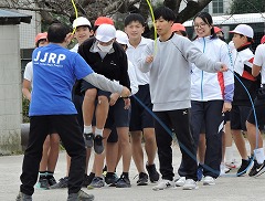 今日は曇り空の下「なわとび教室」を行いました。昨年同様「JJRP(日本縄跳びプロジェクト)」から講師をお招きし、縄跳びの基礎(自分に合った長さや縄の持ち方そして跳び方の基礎から、後ろ跳び、交差跳び、二重跳び、ハヤブサなど高度な跳び方まで、学年に応じて教えていただきました。特に、高学年は「ダブルダッチ」といって、二本のロープを使って、とても速いテンポで跳ぶ跳び方にも挑戦しました。