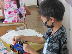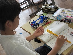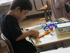 3年生が理科で実験の準備をしていました。ゴム動力で走る車を使うのですが、ゴムの引っ張る強さによって、車に変化があるかを実験します。