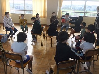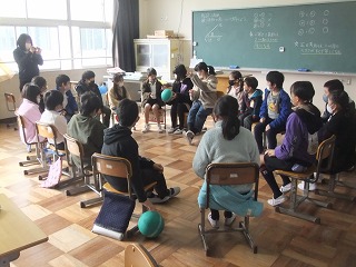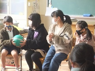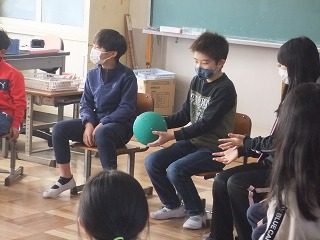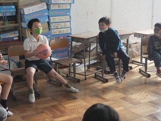 まるくすわったすこやか班の中にボールが1つ回されます。投げてはいけないルールですので、手わたしです。