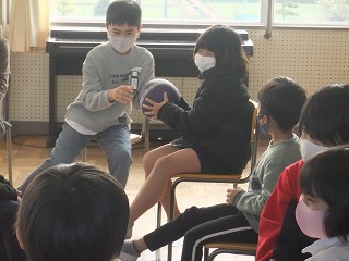 ルールは、音楽がとまったときにボールを持っていた人が、中央に出て自己紹介をします。