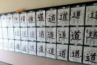5年生書写作品が展示してありました。先日紹介した3年生の書写「日」や「土」と違って曲線が多く「はらい」の技術が必要な字です。少しずつ筆を持ち上げて線を細くしていく必要があるのですが、鉛筆のように手首をひねって払おうとすると、大抵思ったより短くなってしまいます。腕全体を使って大きく書きましょう。