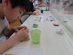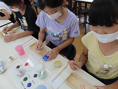 七宝焼きの歴史や作り方などを学び、実際に自分で作品を作ってみます。小さい丸や星、ハート型などの金属板に七宝焼きの原料を乗せます。どんな色のどんな模様にするか一人一人が悩みながら乗せていきました。