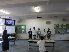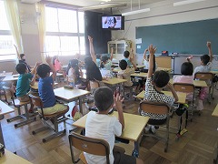 また、生徒指導担当からは夏休みの過ごし方についてお話しがありました。クイズを交えてみんなが気をつける事を考えられるようにしました。下の写真は教室で手を挙げて答えを言っている3年生の様子です。
