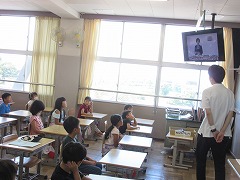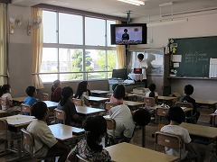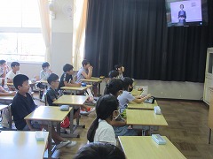 ただ、すでに朝の登校時に気温が30度となり、集会を行う体育館も蒸し暑い状態でしたので、熱中症の危険性を考えて、急遽ZOOMで各教室のタブレットをつなぎ、教室のモニターに映しながらの集会となりました。