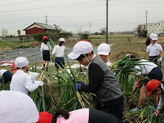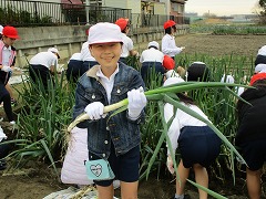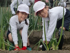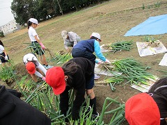 学校の北側のきれいに手入れされた畑で、原さんに教えていただきながら、ねぎの収穫が始まりました。子どもたちの目がキラキラしています。スーパーで売っているねぎよりも太い、おいしそうなねぎです。