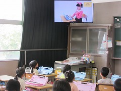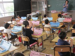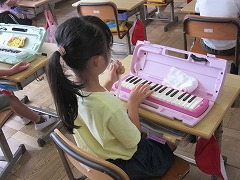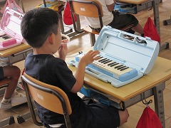 1年生が音楽で、検眼ハーモニカの練習をしていました。吹き口からの息の強さや息の量で、音が安定したりしなかったりします。鍵盤楽器は同じ鍵盤を押せば同じ音が出るのですが、音の大きさや強さは、吹く人の技術が重要です。模範ビデオを見たり、先生の説明を聞いたりしながら何度も練習していました。