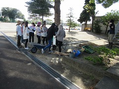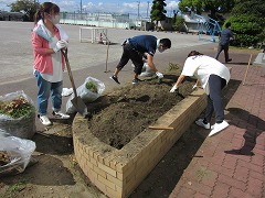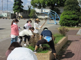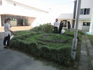 さて、きょうはPTA生活委員会のみなさん、本部役員のみなさんを中心に子どもたちの力ではちょっと難しいところの除草を手伝ってもらいました。理科室前の花壇と北館昇降口前の花壇です。