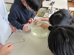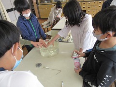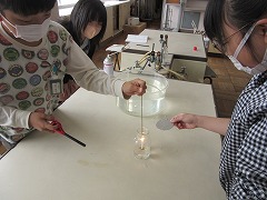 6年生が理科で物の燃え方について実験をしていました。気体の種類によって物の燃え方が変わるのか調べます。