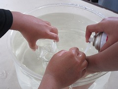 まず集気びんに気体を集めるのですが、周りの空気と混ざらないようにするため水槽の中で水を満たした集気びんをさかさまにして中に気体を吹き込みます。