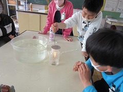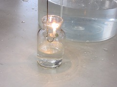 水中で集気びんにふたをして外に出し、火をつけたろうそくをふたの隙間からさしこむと・・・。