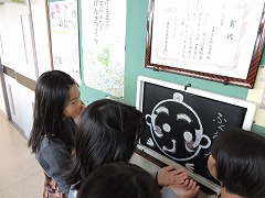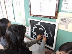 校長室の廊下には「ふくおう福笑い」がありますが、毎日のように顔が変わっています。廊下を通る子どもたちがいつも福笑いをして変えているからです。先日も、数人の女の子が交代で福笑いに挑戦していました。