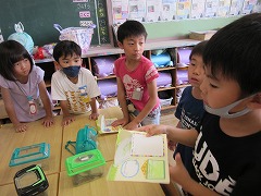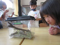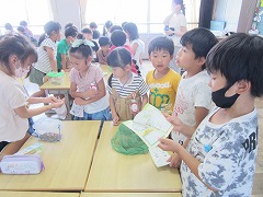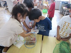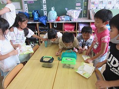 2年生が虫を捕まえていたことを以前紹介しましたが、先日、1年生の子たちにそれらの虫を紹介する「生き物ランド」を催しました。自分で捕まえた虫などについて、自分で調べたことや知っていることをまとめ、1年生の子に見せながらお話ししました。