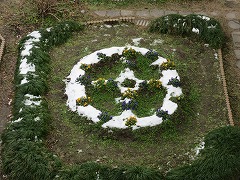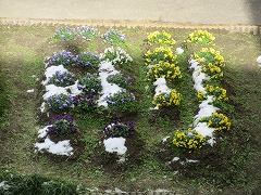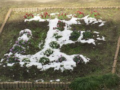 ただ、おかげで、中庭の花壇のデザインがとても見やすくなっています。同じ条件の花壇の中でも、土の上より、草花の葉の上に乗っている雪の方がしっかり残っています。地面と雪の間の空気が熱を遮断しているためでしょうか。