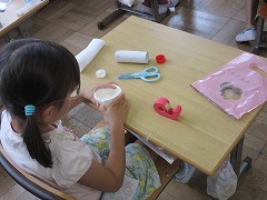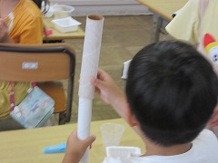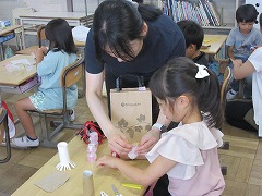 1年生が図工でスタンプを作っていました。トイレットペーパーの芯やプリンなどのカップを使い、ラップやプチプチのようなその他の材料をくっつけたりしてつくります。どんなスタンプになるのかな?