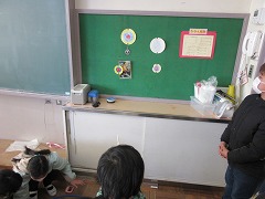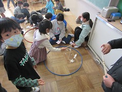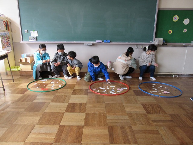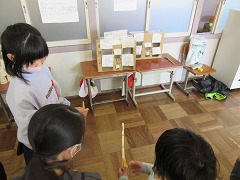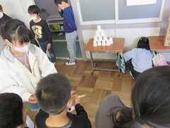 4年2組では、自分たちで考えたおもちゃであそんでもらおうと、1年2組のみなさんを招待していました。