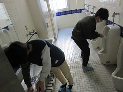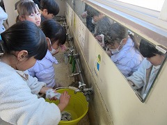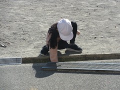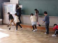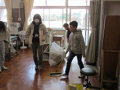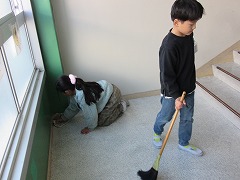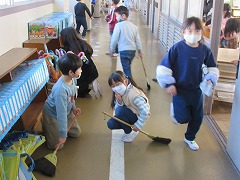 1年生や2年生は動く範囲が少なくてすむように、教室中心に掃除を行っています。みんなで、ほうき、ちりとり、ぞうきんなど、それぞれ決められたところの掃除をがんばっていました。外の掃除は、側溝のふたを先生に開けてもらって中にたまっている落ち葉をとって袋に詰めていました。