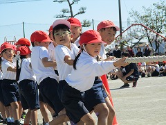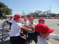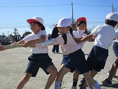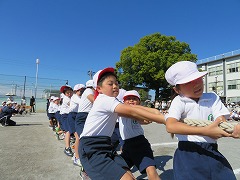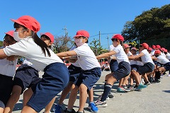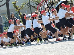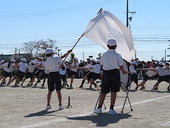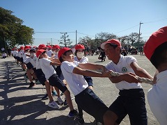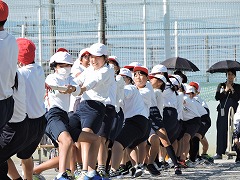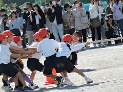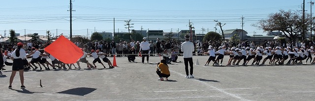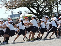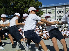 ⑥綱引き 2学年ずつ3試合、全ての学年が対抗します。なかなか決まらないと,1分間引き続けるのでヘトヘトになってしまいます。