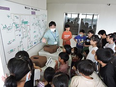まずは八穂クリーンセンターです。とても大きな建物で圧倒されそうでした。最初に、集まってきたゴミを分別して焼却したり埋め立てるための工夫をビデオで学習し、後からパッカー車で運んできたゴミを実際にピット(一時的にゴミをためておく施設)に入れる現場を見学しました。実際に捨てられるゴミの中に乾電池やバッテリー等が入っていると爆発したり火事になったりすることを聞いたり、