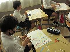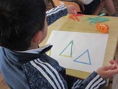 3年生が細長い棒を使って三角形を作っていました。棒は色ごとにそれぞれ長さが決まっていますので、