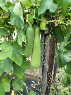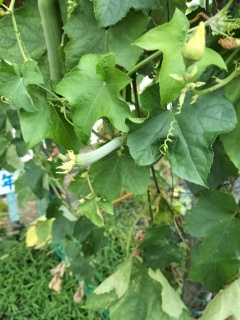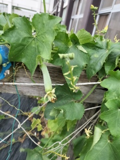4年生が理科で育てているヘチマに実がなっていました。夏休み前にはまだ、雄花ばかりが咲き始めていて、雌花は影も形もありませんでしたが、約1か月の夏休みの間に、雌花も生長し無事に受粉したようです。