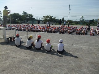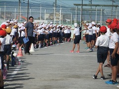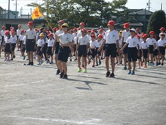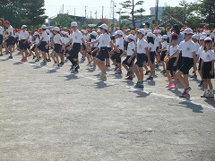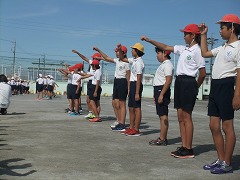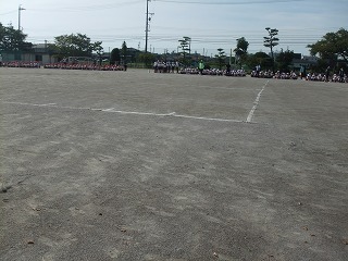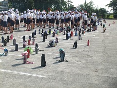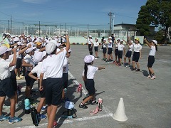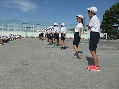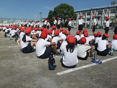 こんな天気ですから、「うまくいけば、早く終わるよ!!」という声がかかります。みんなの協力のかいあって、運動場の実際の控え席に座り、開会式閉会式の入退場の方法を覚えました。前に詰めすぎると、ラジオ体操の場所がなくなってしまいます。