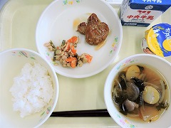 十五夜ハンバーグは月の模様にちなんでウサギの形をしていました。お月見汁にはお月見をイメージした丸いかまぼこが入っていました.そしてデザートも「お月見ゼリー」でした。
