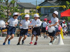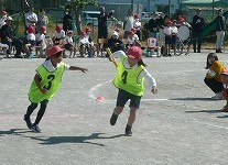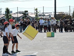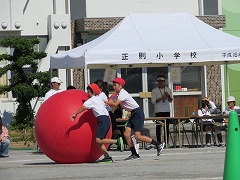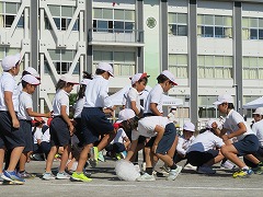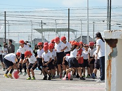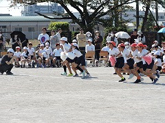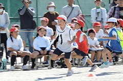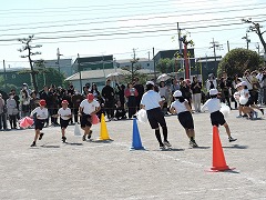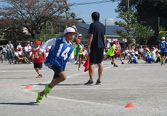 ⑧正則ハリケーン 正則小のスポーツフェスティバルに嵐を巻き起こす台風が走り回りました。コーンのところで右回りしたり左回りしたりと大変です。そして、バトンタッチするところでは待っている全員の足の下を棒がくぐり、頭の上を戻ってくるので、走り終わった子たちも休むことができません。