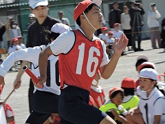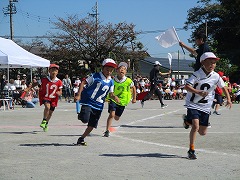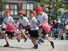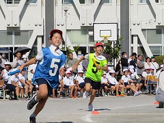 ⑩赤白対抗代表リレー さて、スポーツフェスティバルの最後の種目、大詰めの代表リレーです。各学年の代表者が、しのぎを削ります。女子男子それぞれ2点が入るので、みんな固唾(かたず)を飲んで見守ります。 さあ、結果は如何(いか)に!