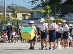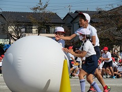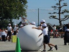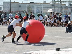 ⑨大玉ころがし3年・5年 大玉ころがしは運を味方にしなければなりません。サイコロを振って出た色、黄色か緑かによって回ってくるコーンまでの距離が変わります。負けていたと思っても大逆転があり得るちょっと怖い種目とも言えます。
