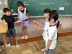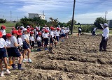 9月16日(火)総合的な学習の時間に、地域の原さんのご協力のもと、ねぎの植え方を教えていただきました。まだ細長いねぎをうねに立てかけ、根元に土をかぶせました。