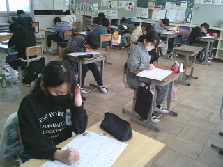 漢字のテストに取り組んでいました。覚えた漢字50問を、集中して書いていました。がんばっています!