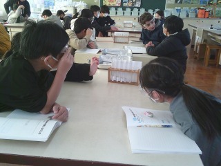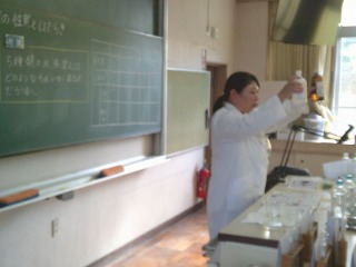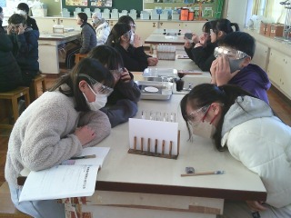 水溶液についての実験をしていました。白衣を着た先生から今日のめあてや注意事項を聞き、試験管に入った5種類の水溶液の特徴を調べました。