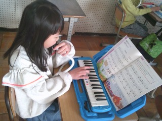 鍵盤ハーモニカで「汽車は走る」という曲を練習しました。汽車の汽笛を二つの音を同時に弾くことで表現します。鍵盤ハーモニカを弾く人、歌を歌う人と分かれて音楽に合わせて取り組んでいました。歌も鍵盤ハーモニカも上手でした。