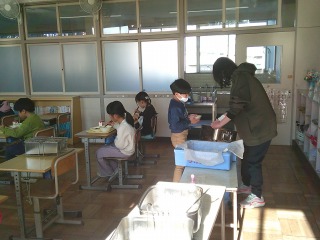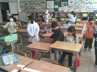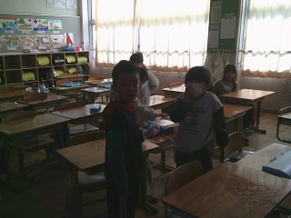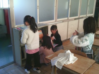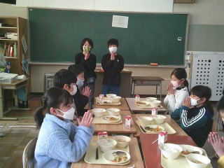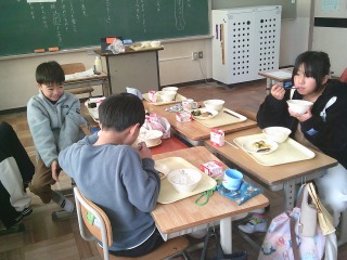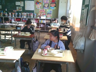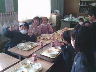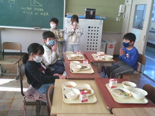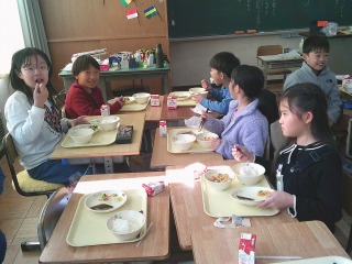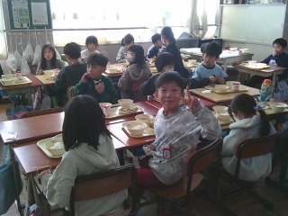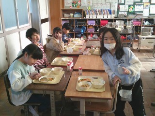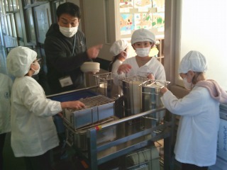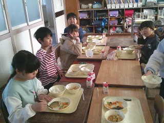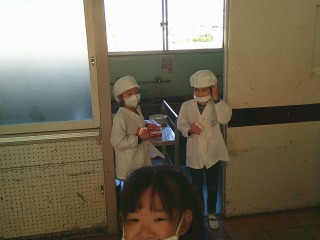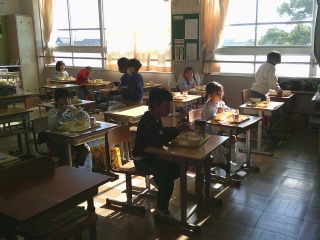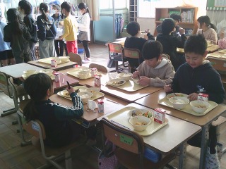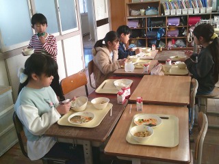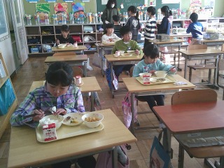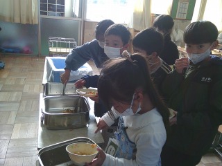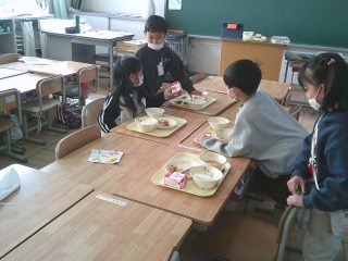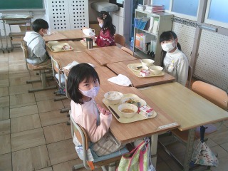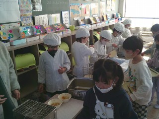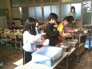 準備、いただきます、会食の様子です。かわいいエプロン姿で、低学年の児童が準備をがんばっていました。