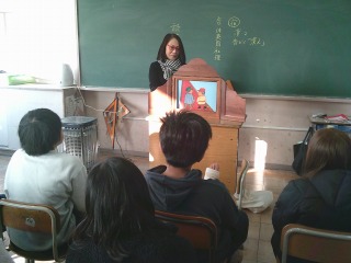 有名な「注文の多い料理店」を紙芝居で聞かせていただきました。間の取り方や次の場面への移り方など、さすが美和図書館読み聞かせボランティアの方だと思いました。後ろの子は立って見ながら話の中に入り込んで聞いていました。