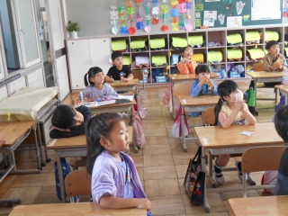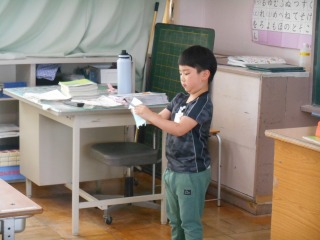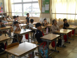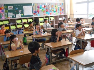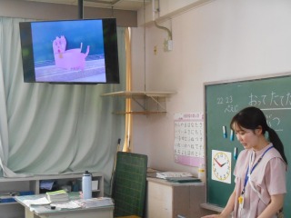 みんなで作った作品を鑑賞していました。作品一つ一つに拍手がわいていました。