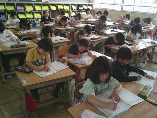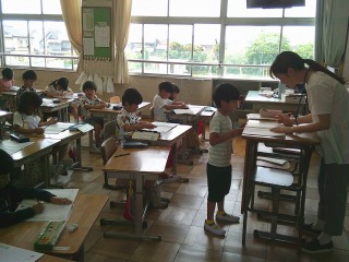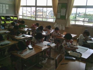 「す」やを書く練習をしていました。「ま」は横長に、「す」は縦長に丸くするのがなかなか難しいようでした。
