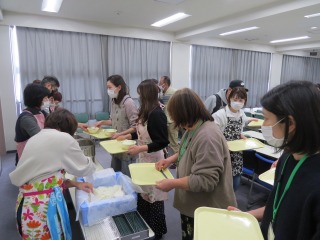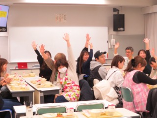 前半は、栄養教諭が給食センターでの給食ができるまでの行程、アレルギー対応などについて詳しく動画を交えて説明をしました。後半はいよいよ試食。子どもたちと同じような体験をしていただけるよう、〇十年ぶりの給食当番、減らした献立をほしい方に食べていただくためにじゃんけんもしていただきました。いただきますをし、グループになって和気あいあいと給食を食べていただきました。