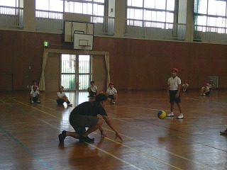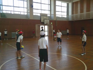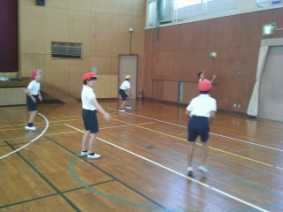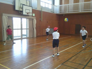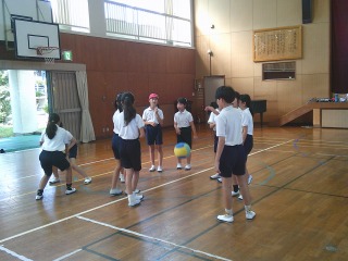 グループに分かれ、ソフトバレーボールを使ってバレーボールのアンダーハンド・オーバーハンドパスのp練習をしていました。輪になって、相手の打ちやすい所へ投げようとしていました。