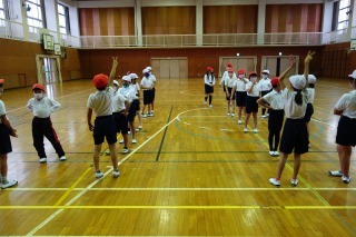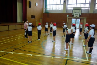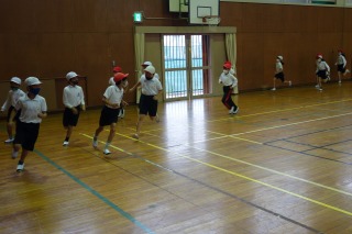 4年2組の体育は体育館で行いました。準備運動をしてから体育館を2周走って、体を温めました。