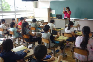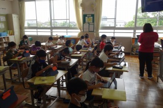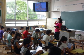 4年2組の外国語はタブレット端末を使って学習しました。「ロイロノート」を使って、英語のクイズに取り組みました。