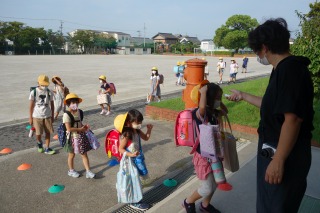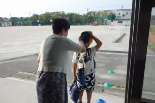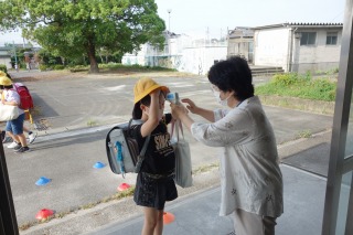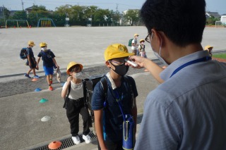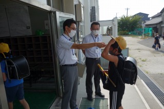 登校時に昇降口での検温が始まりました。熱がないことを確認してから、校舎に上がります。